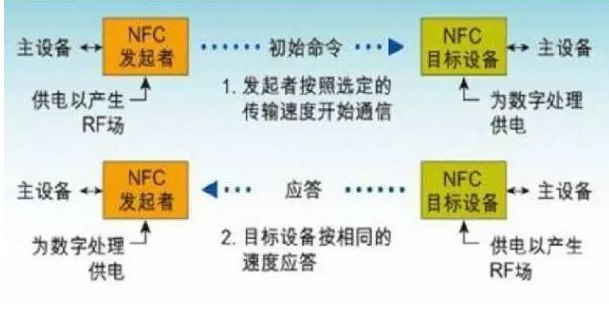 NFC通信在发起设备和目标设备间发生,任何的NFC装置都可以为发起设备或目标设备。两者之间是以交流磁场方式相互耦合,并以ASK方式或FSK方式进行载波调制,传输数字信号。发起设备产生无线射频磁场来初始化(调制方案、编码、传输速度与RF接口的帧格式);目标设备则响应发起设备所发出的命令,并选择由发起设备所发出的或是自行产生的无线射频磁场进行通信。